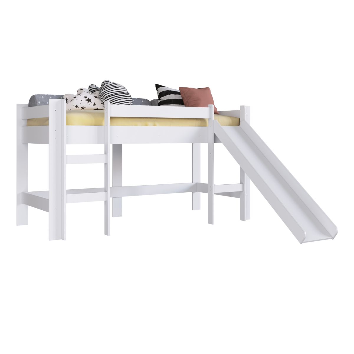 La cama elevada con tobogán es un producto diseñado para unir comodidad y diversión. Tiene dos escalones y tobogán para que el niño acceda a la cama con total seguridad. En la parte inferior hay un espacio para ser utilizado de diferentes formas con avíos para colocar una cortina si se quiere